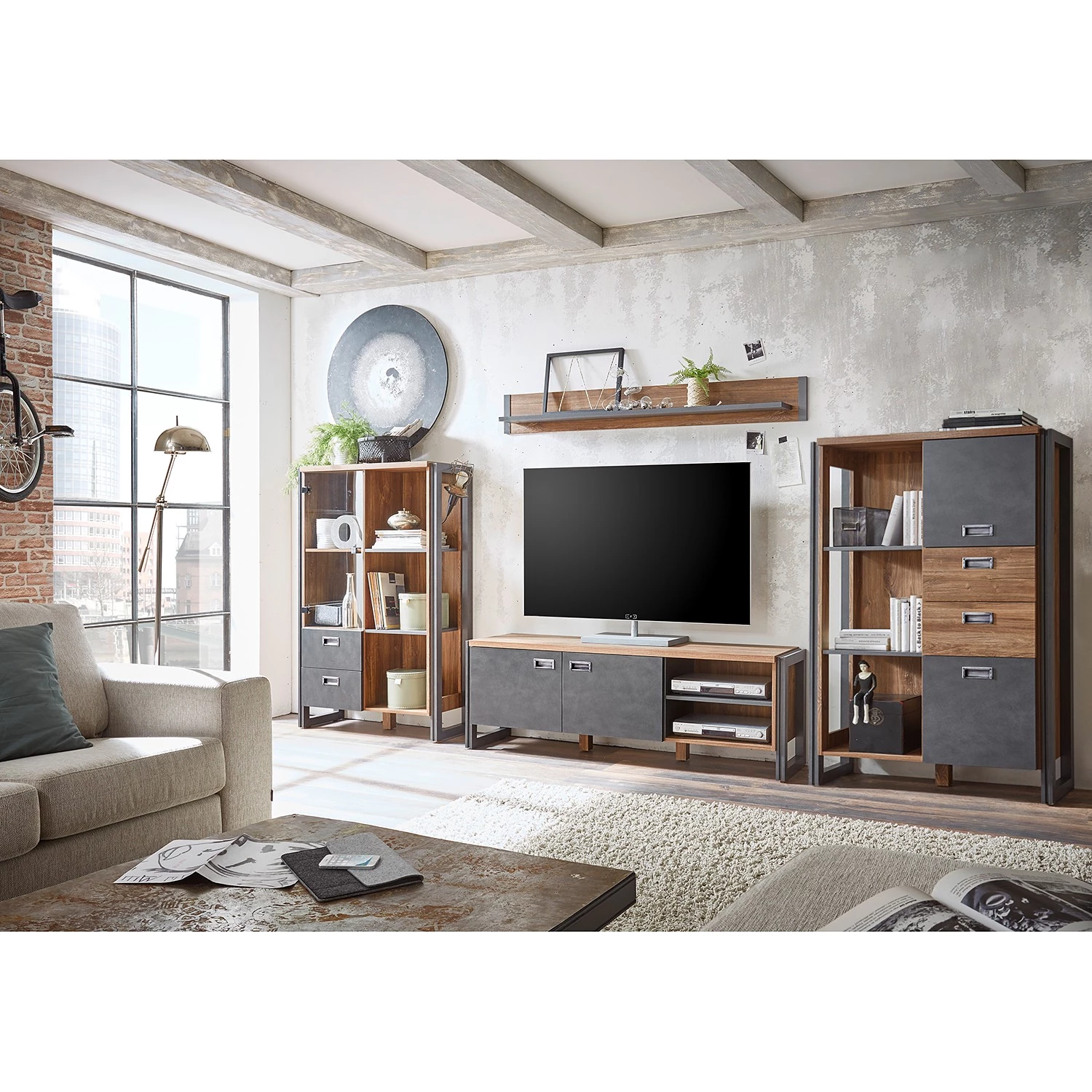 - Contenu de la livraison : Ensemble comprenant 2 étagères, 1 meuble TV et 1 tablette murale sans accessoires