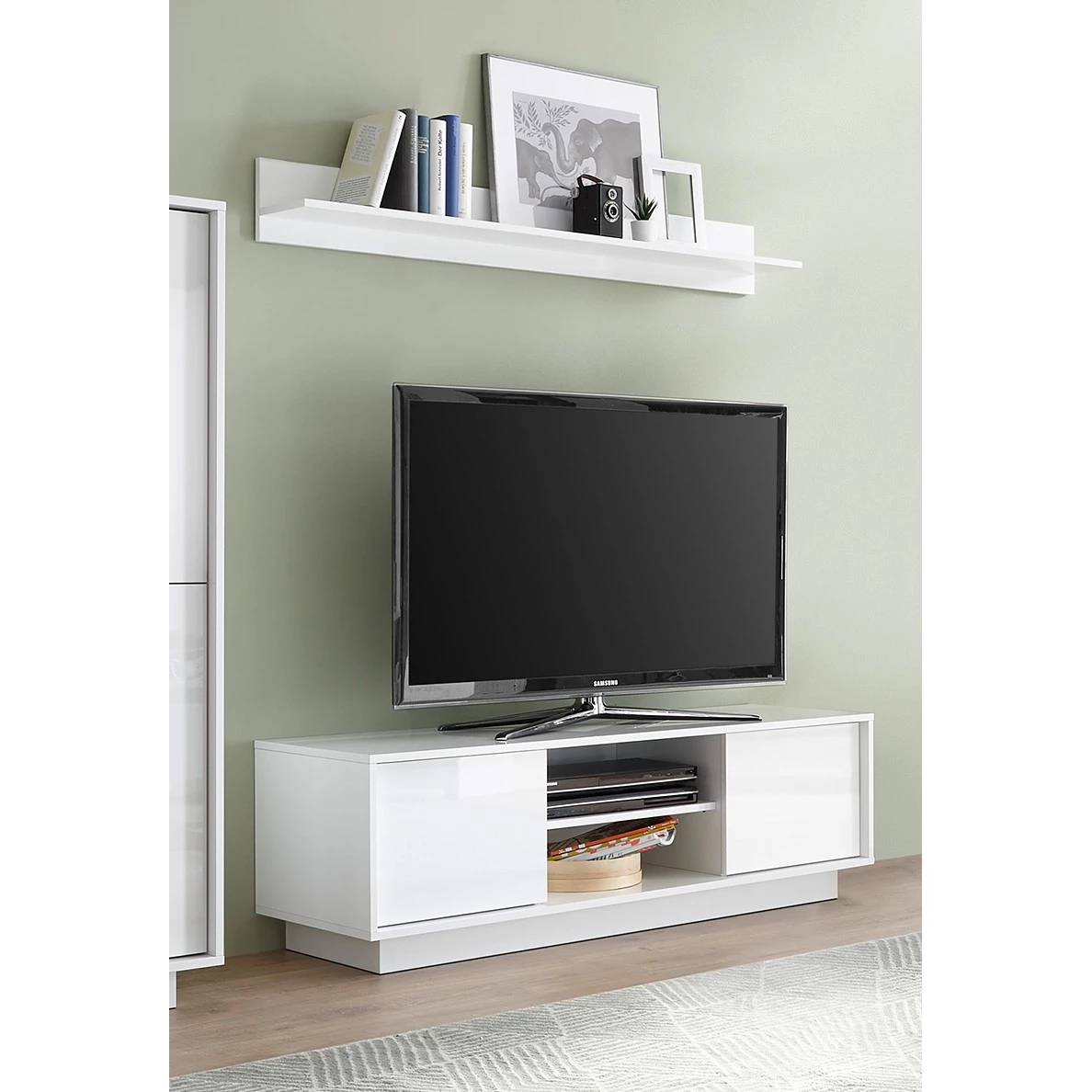 - Contenu de la livraison : Ensemble comprenant 1 tablette murale et 1 meuble TV sans éclairage ni accessoires
