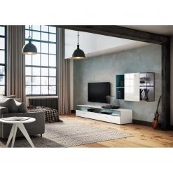 - Contenu de la livraison : Ensemble meubles TV comprenant un 1 meuble TV avec abattant, 1 élément mural avec abattant, 1 vitrine murale avec 2 portes et 3 étagères murales avec effet 3D