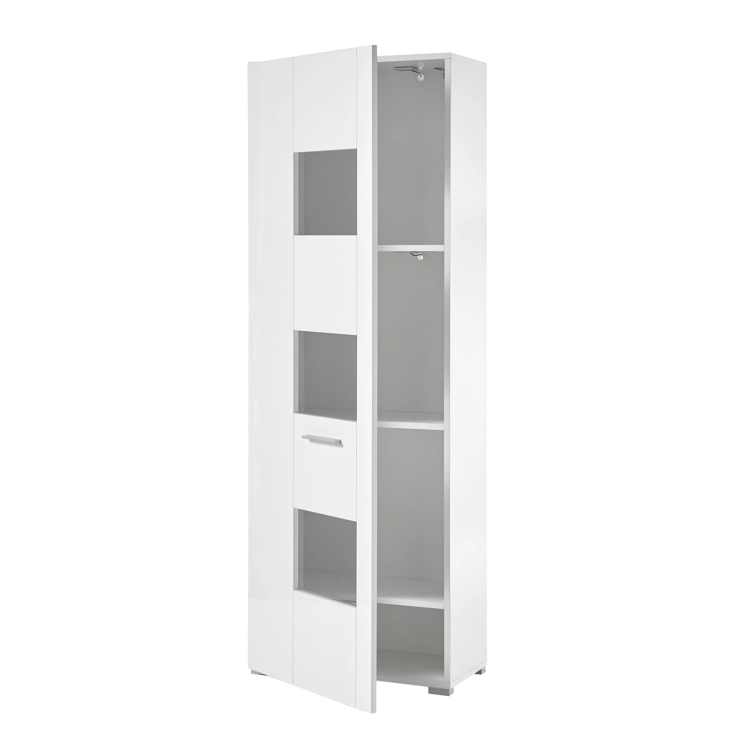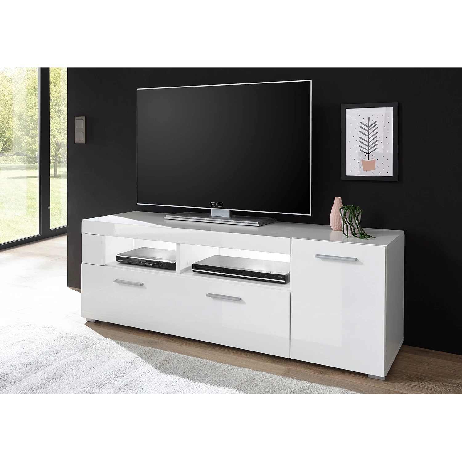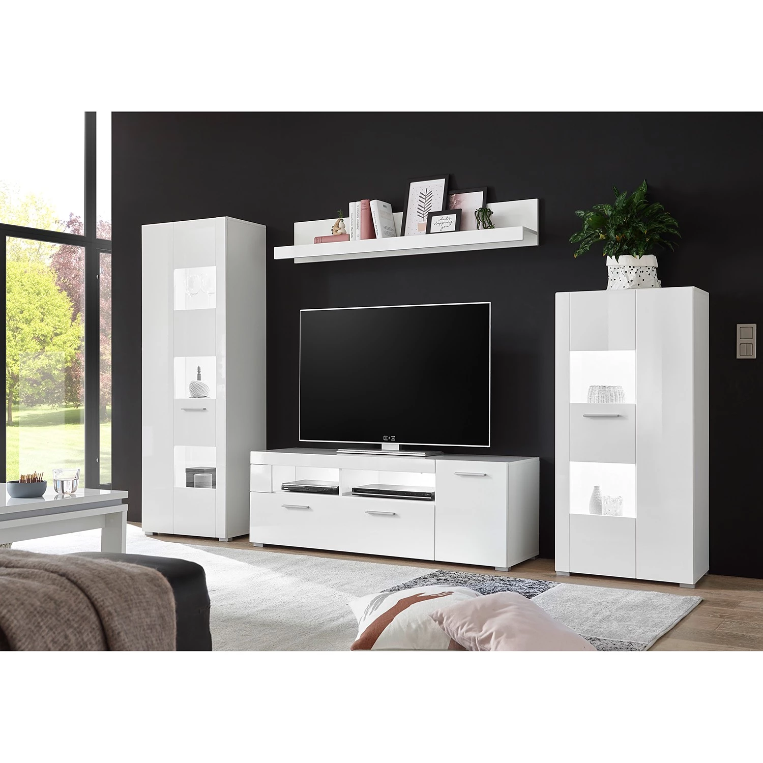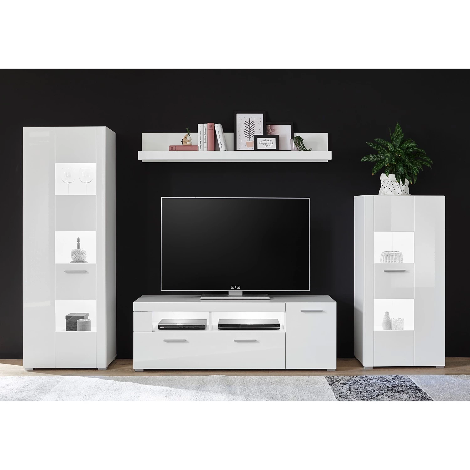 - Contenu de la livraison : 1 vitrine, 1 tablette murale, 1 meuble TV et 1 buffet haut, sans éclairage ni accessoires