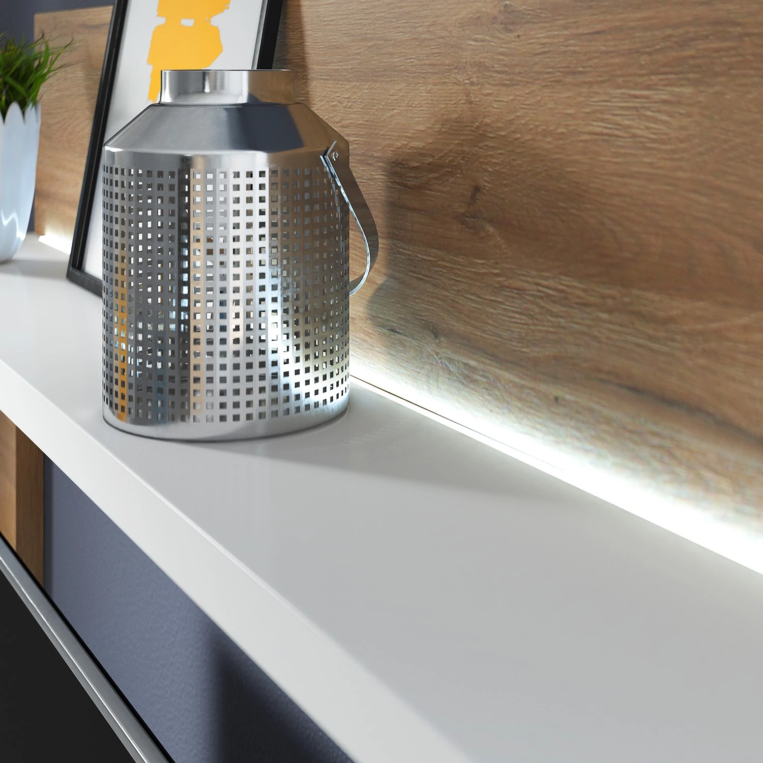 - Contenu de la livraison : Ensemble comprenant 1 étagère murale, 1 meuble haut et 1 meuble TV, avec éclairage inclus, sans accessoires