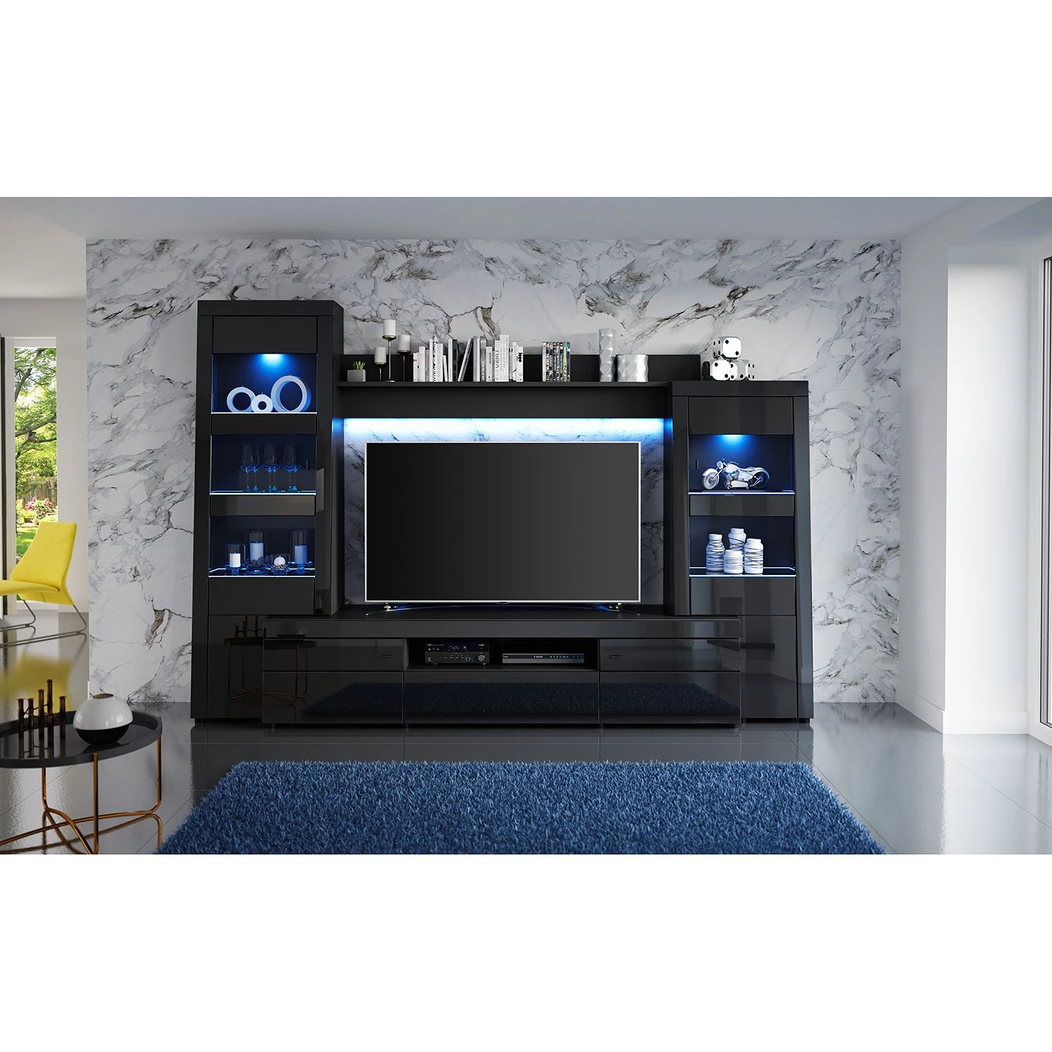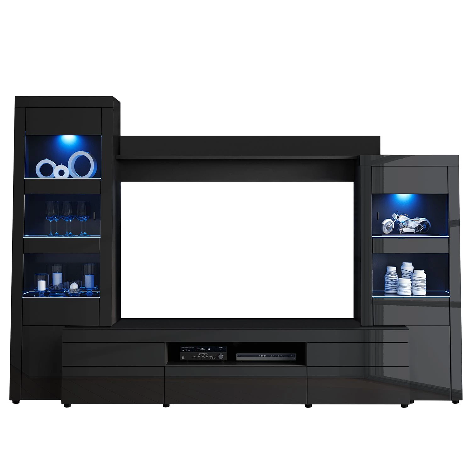 - Contenu de la livraison : Ensemble comprenant 1 meuble TV, 2 vitrines et 1 tablette murale