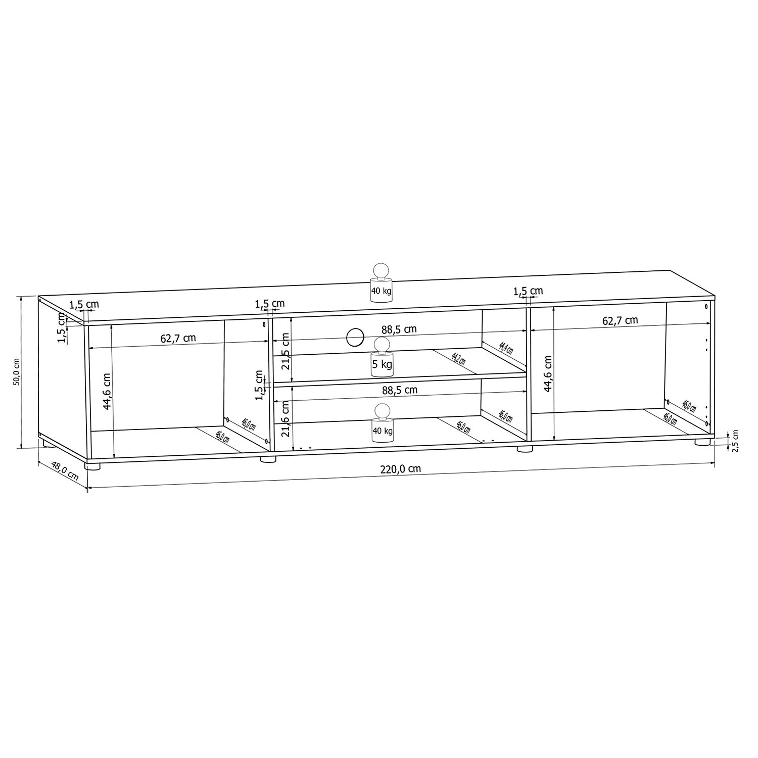 - Charge maximale des étagères : 5 kg