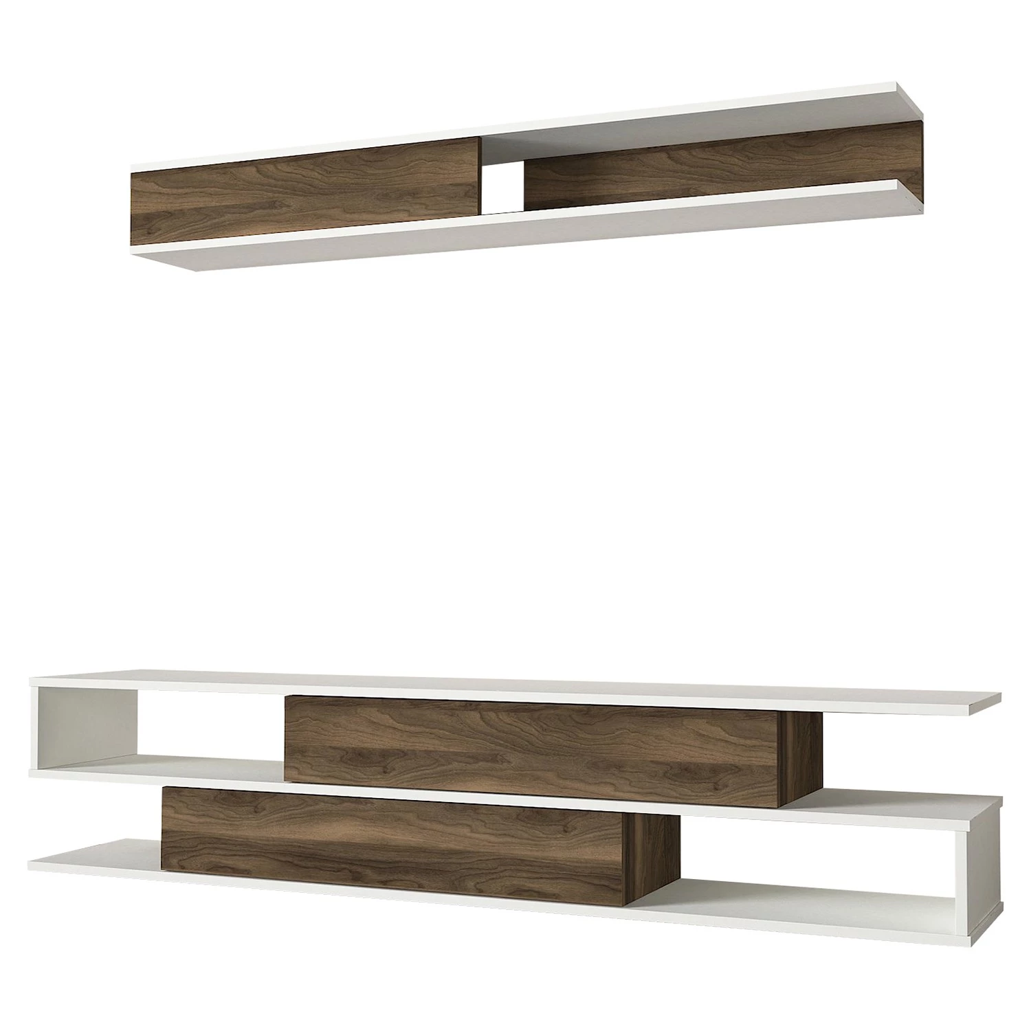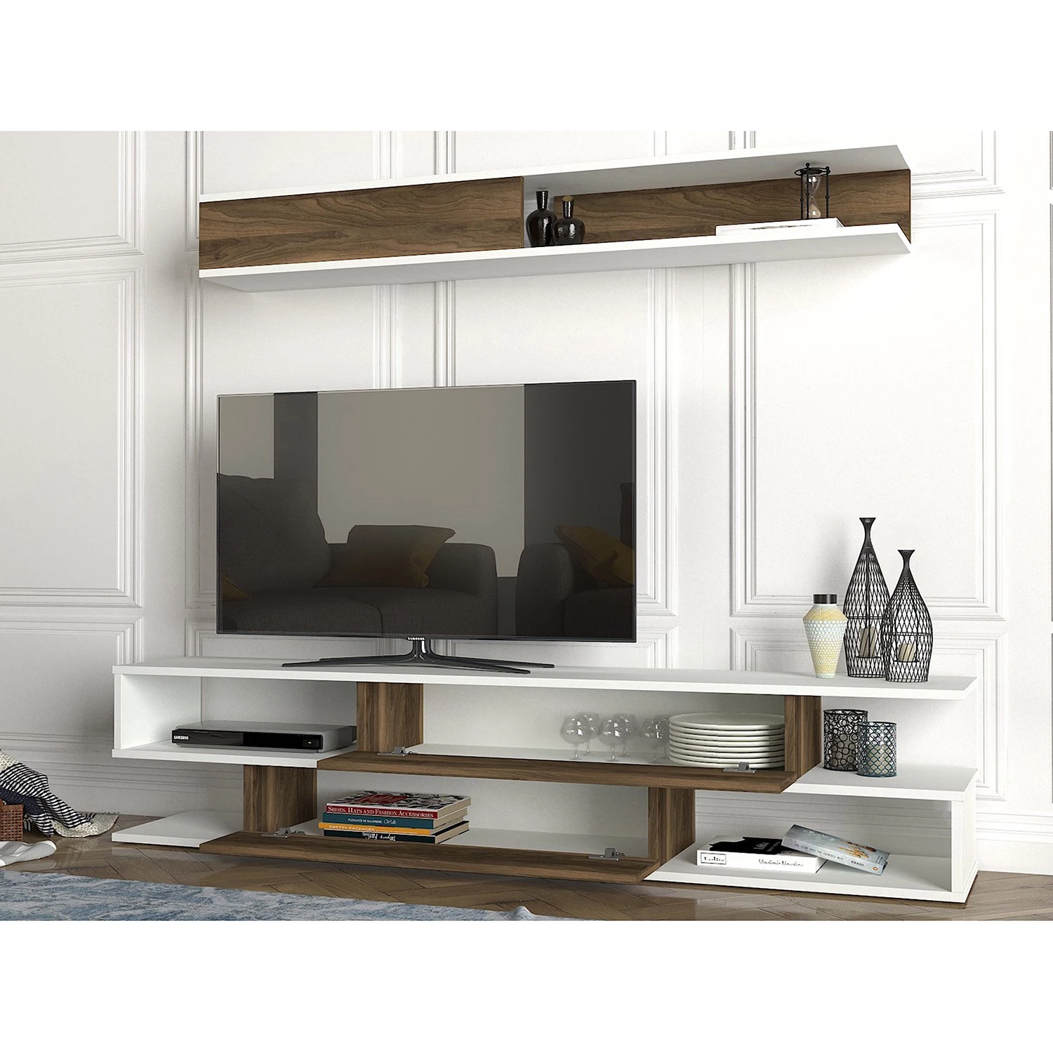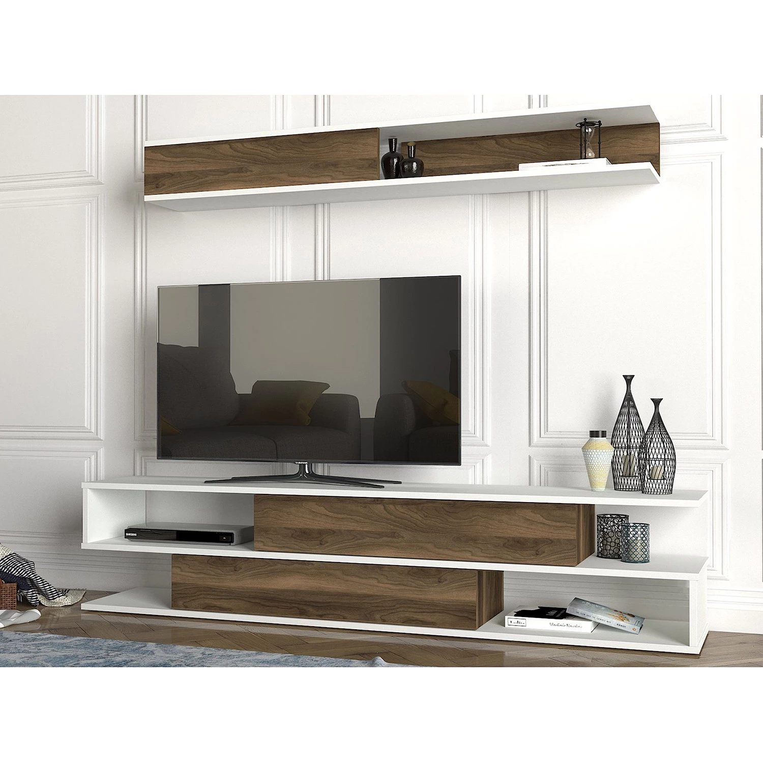 - Contenu de la livraison : Ensemble comprenant 1 meuble TV et 1 tablette murale, sans éclairage ni accessoires