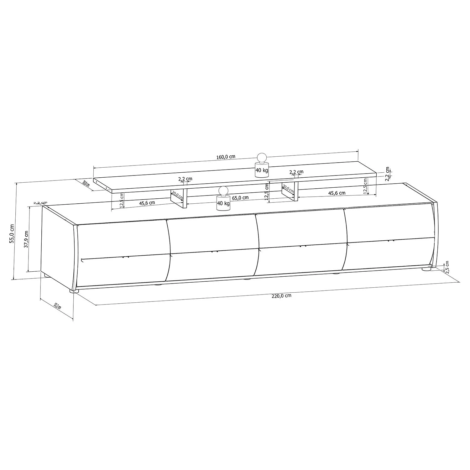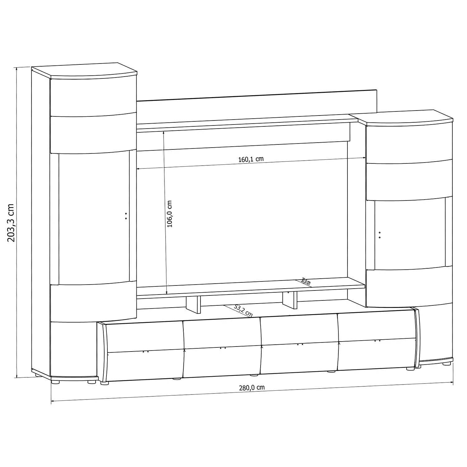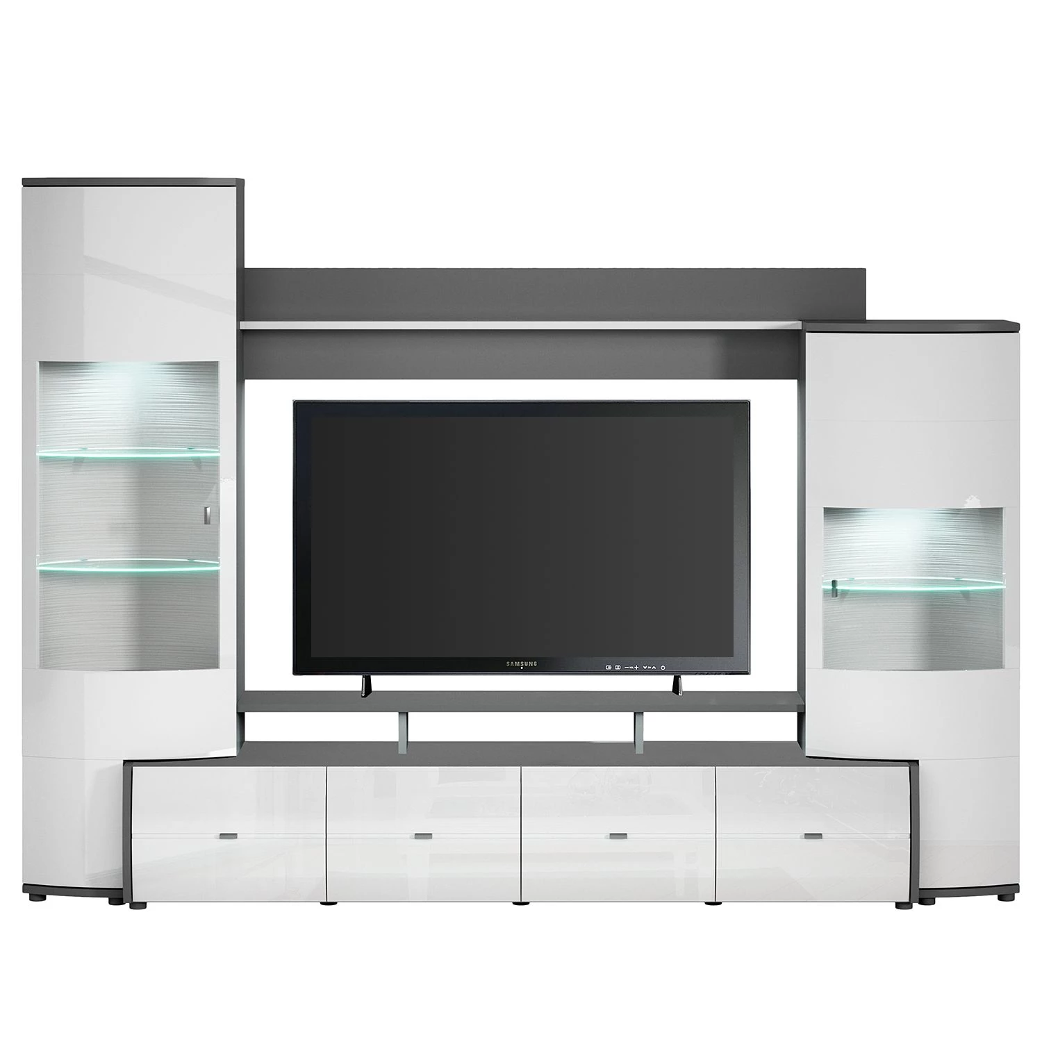 - Contenu de la livraison : Ensemble comprenant 1 meuble TV, 2 vitrines et 1 étagère murale, sans lumière