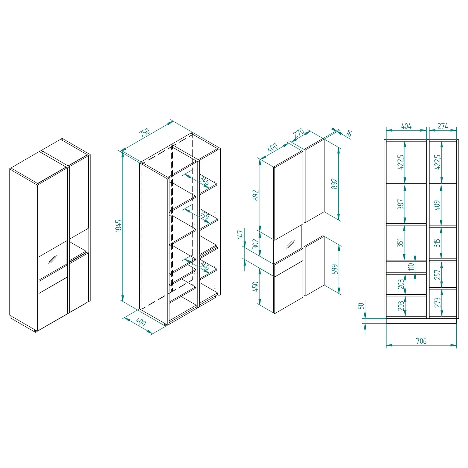 - Contenu de la livraison : Ensemble comprenant 1 vitrine, 1 tablette murale, 1 meuble TV et 1 buffet haut, sans éclairage ni accessoires