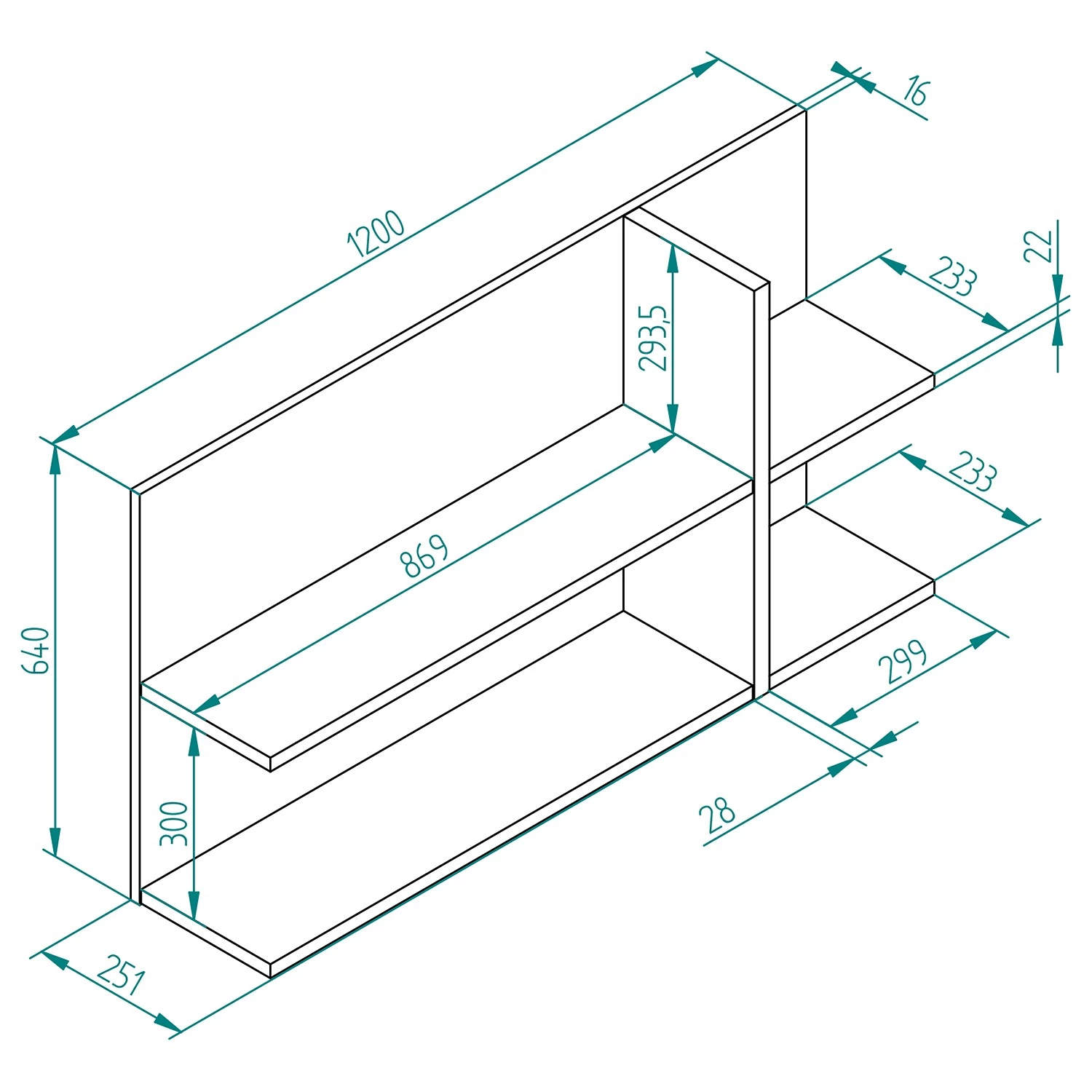 - Étagère murale : 120 x 64 x 25 cm