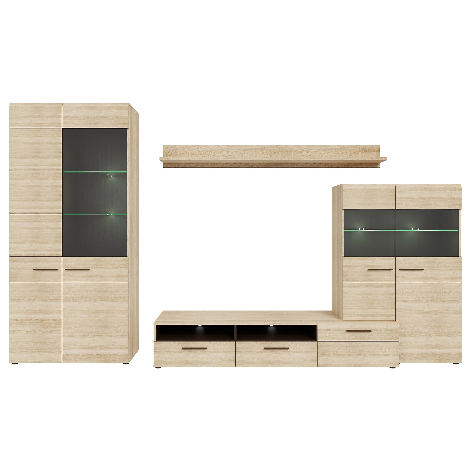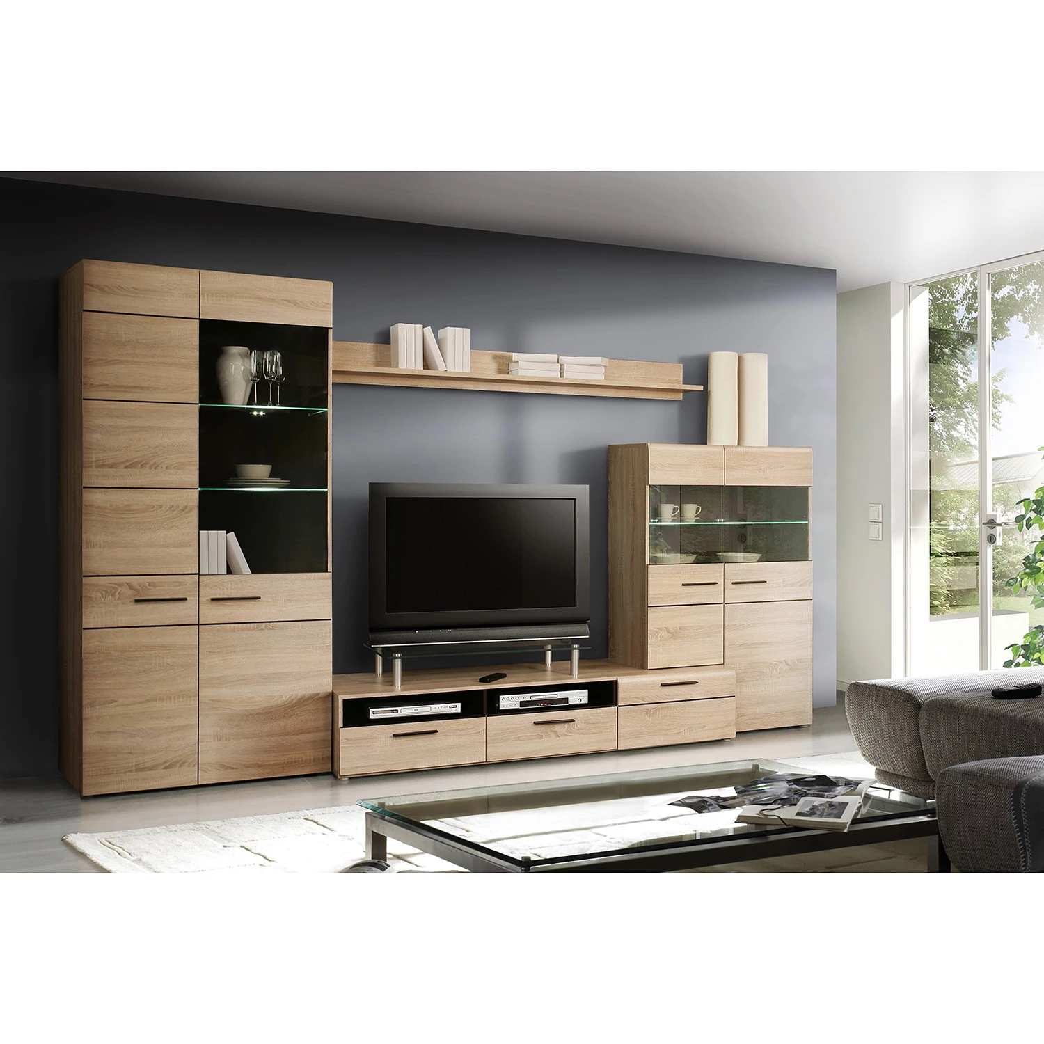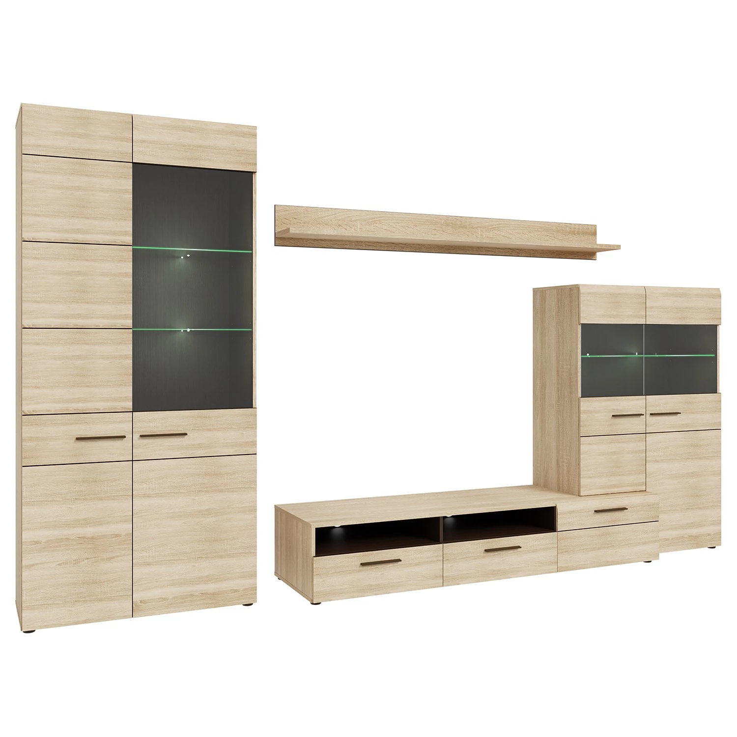 - Contenu de la livraison : Ensemble comprenant 1 vitrine, 1 tablette murale, 1 meuble TV et 1 buffet haut, avec éclairage et sans accessoires