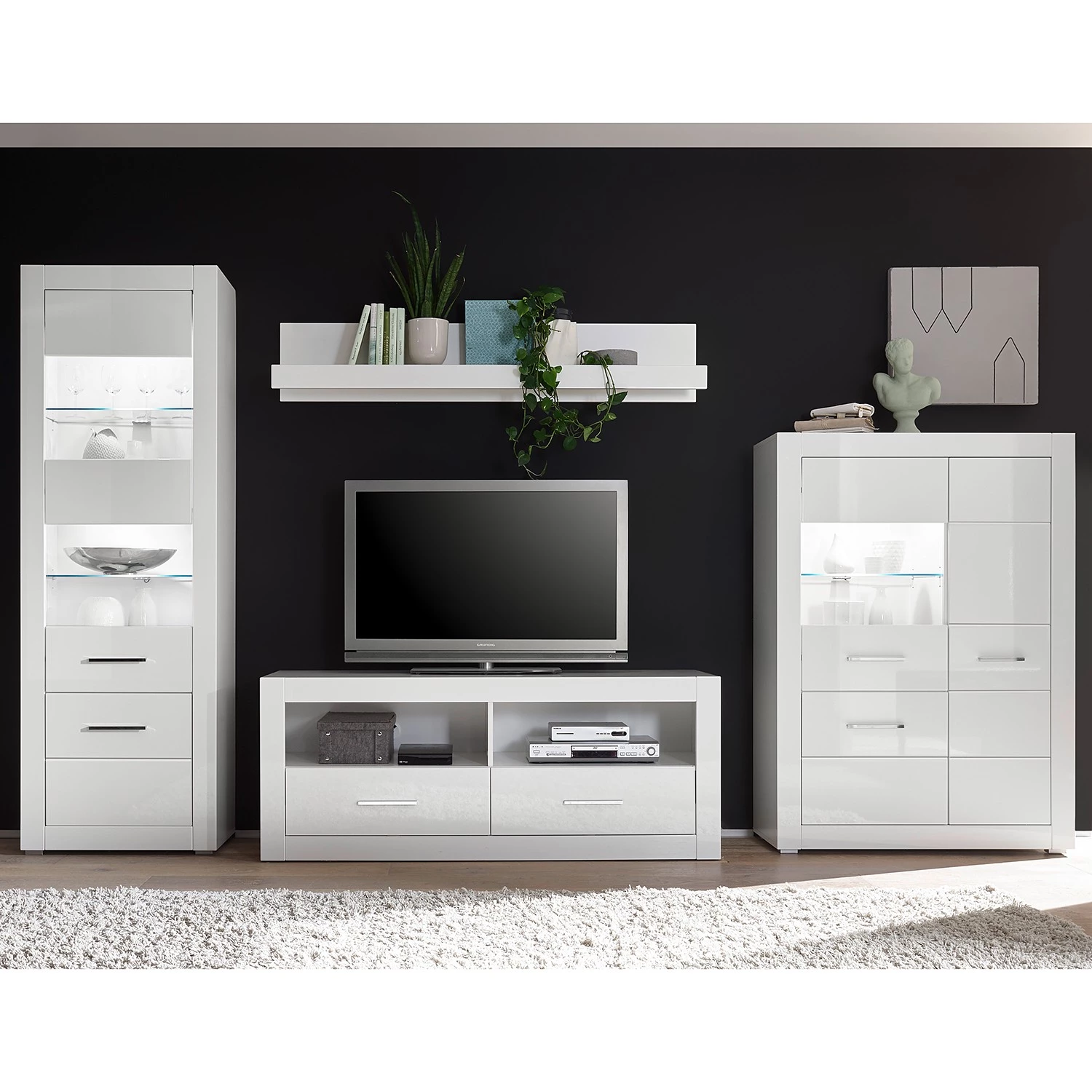 - Contenu de la livraison : Ensemble comprenant 1 vitrine, 1 tablette murale, 1 meuble TV et 1 buffet haut, sans éclairage ni accessoires