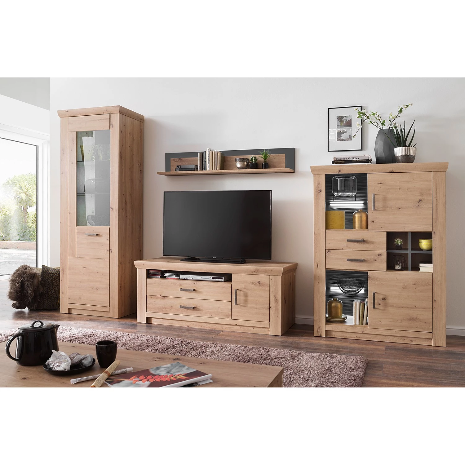 - Contenu de la livraison : 1 vitrine, 1 étagère murale, 1 meuble TV et 1 buffet haut, sans accessoires