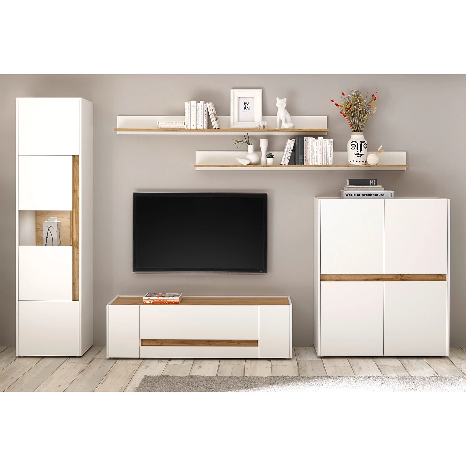 - Contenu de la livraison : Ensemble comprenant 1 vitrine, 2 tablettes murales, 1 meuble TV et 1 buffet, sans éclairage ni accessoires