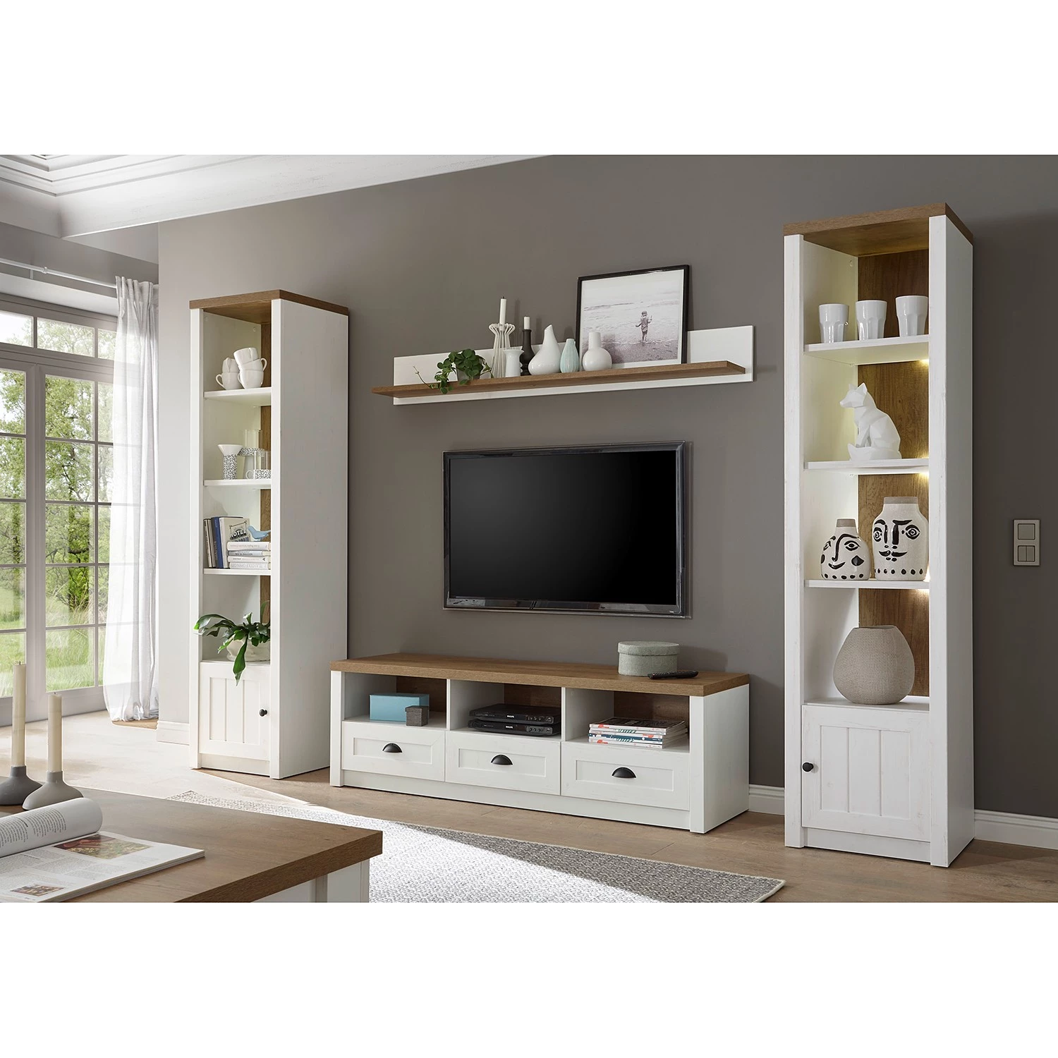 - Contenu de la livraison : 1 tablette murale, 1 meuble TV et 2 étagères, sans éclairage ni accessoires