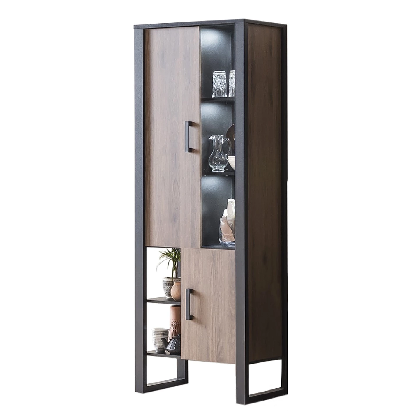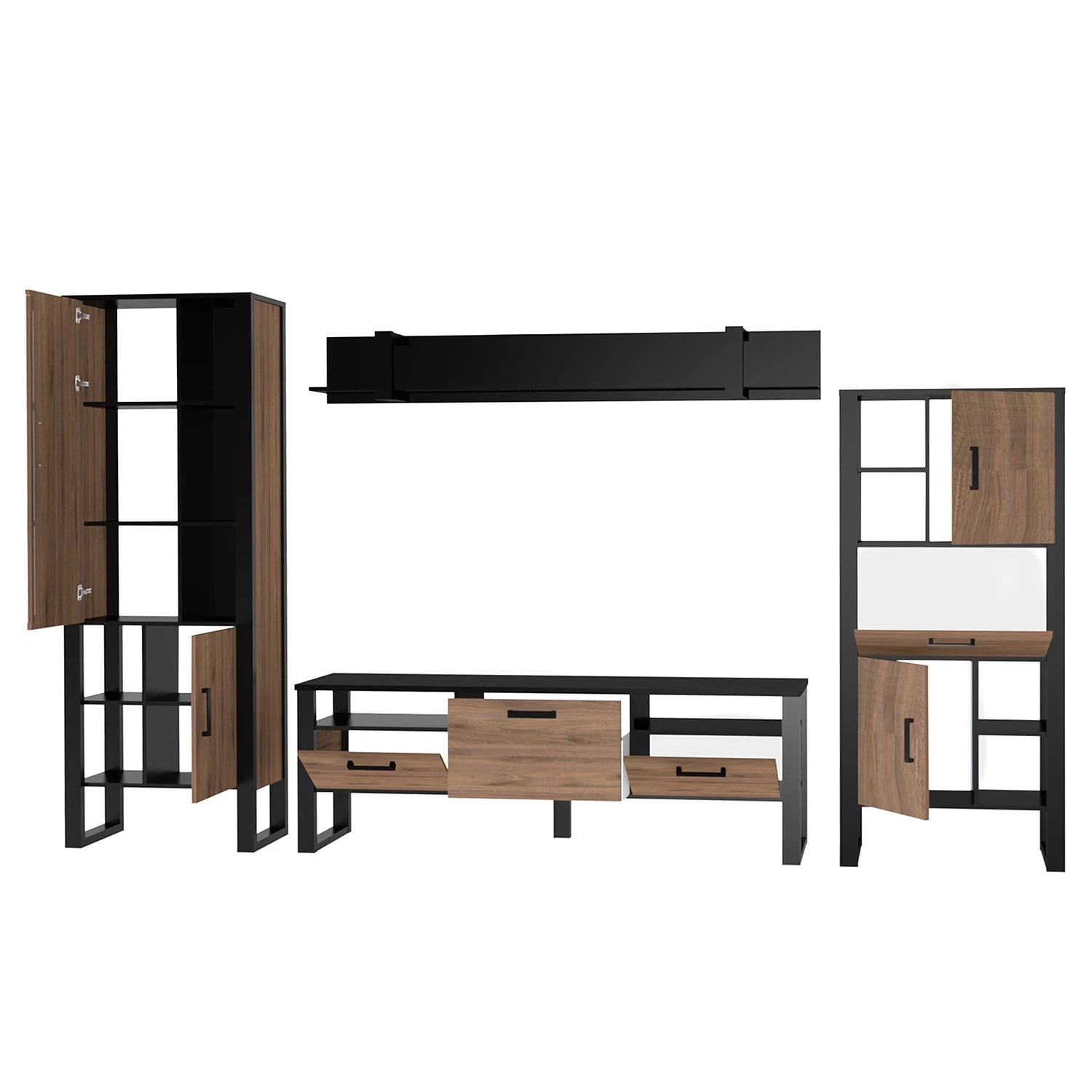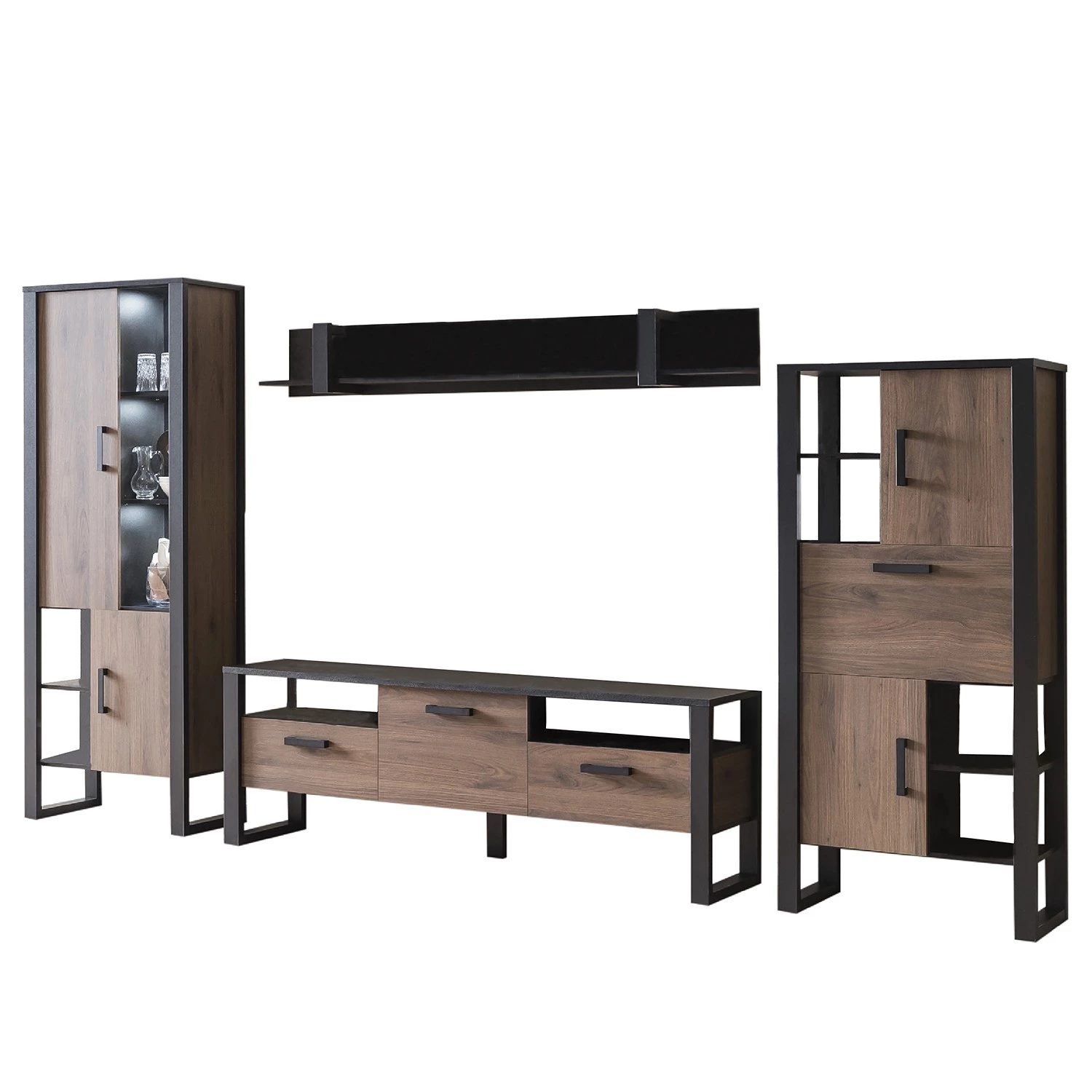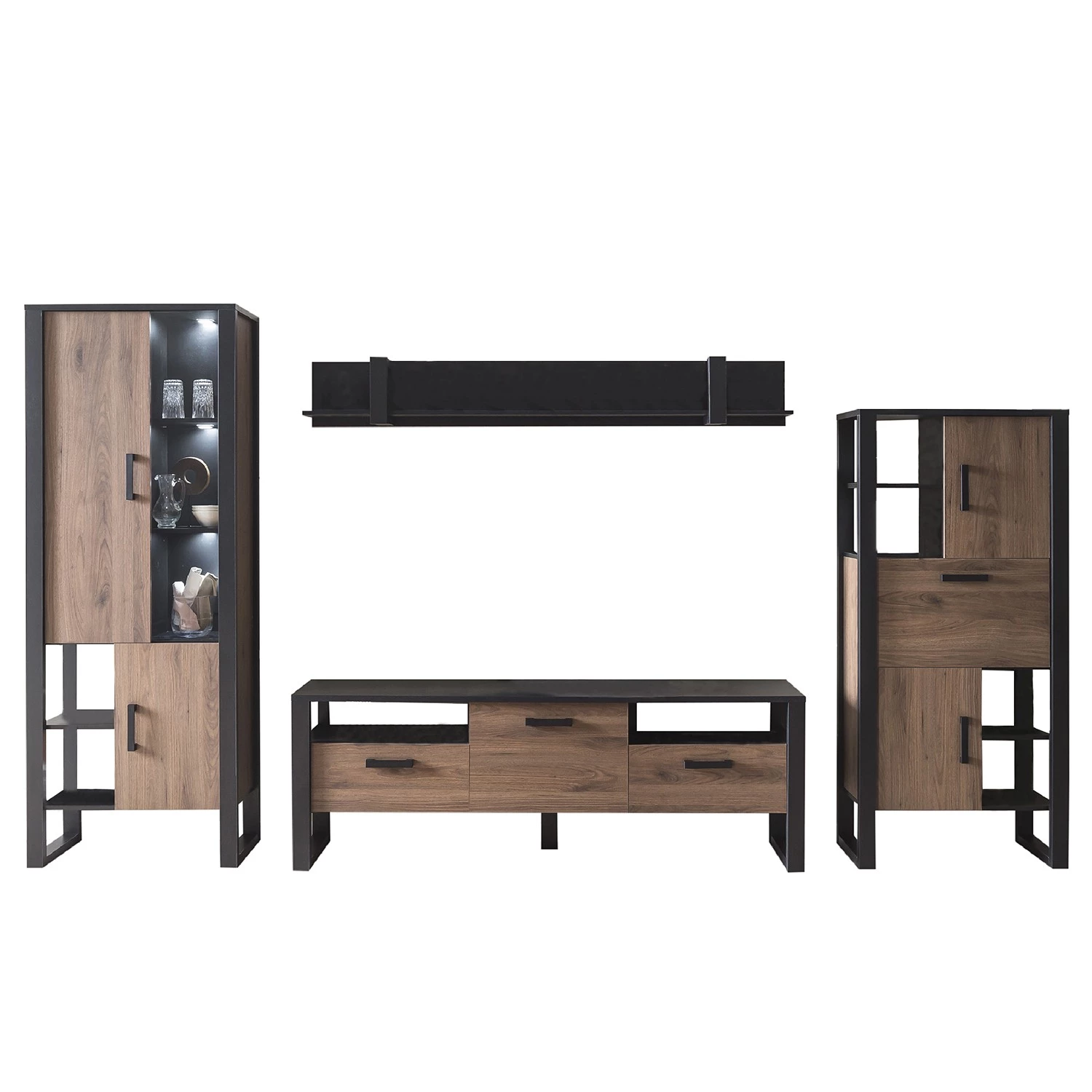 - Contenu de la livraison : Ensemble comprenant 1 vitrine, 1 tablette murale, 1 meuble TV et 1 étagère, sans éclairage ni accessoires