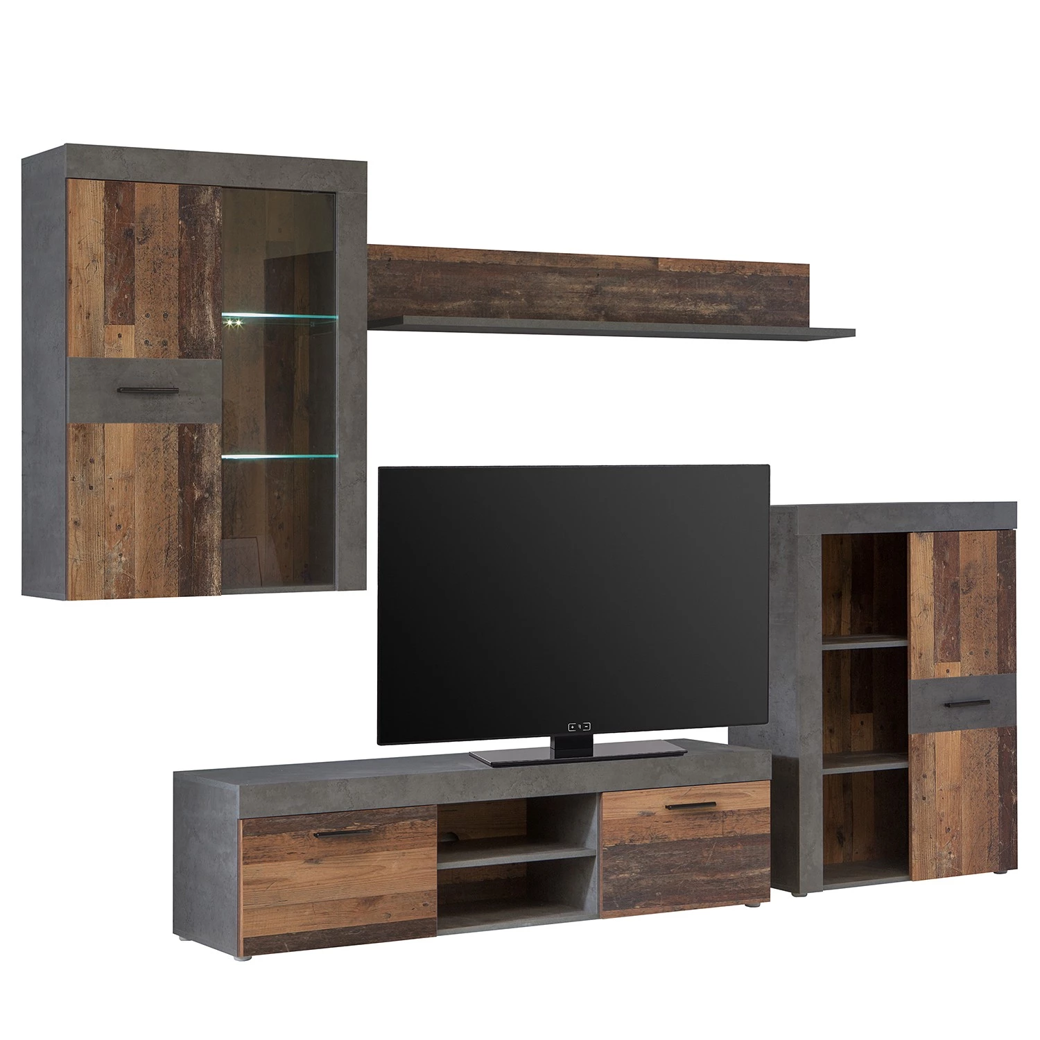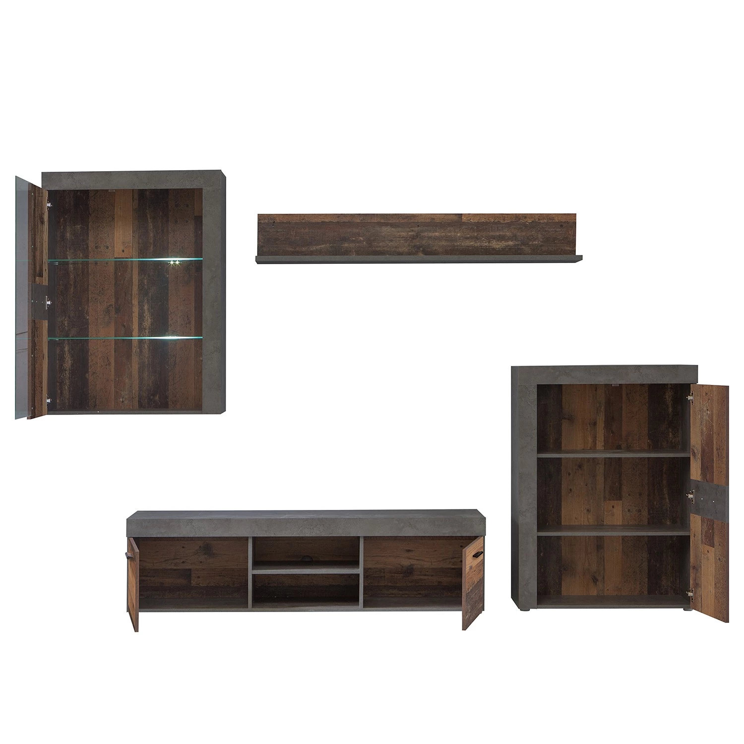 - Contenu de la livraison : Ensemble comprenant 1 armoire suspendue, 1 tablette murale, 1 meuble TV et 1 buffet, sans éclairage ni accessoires
