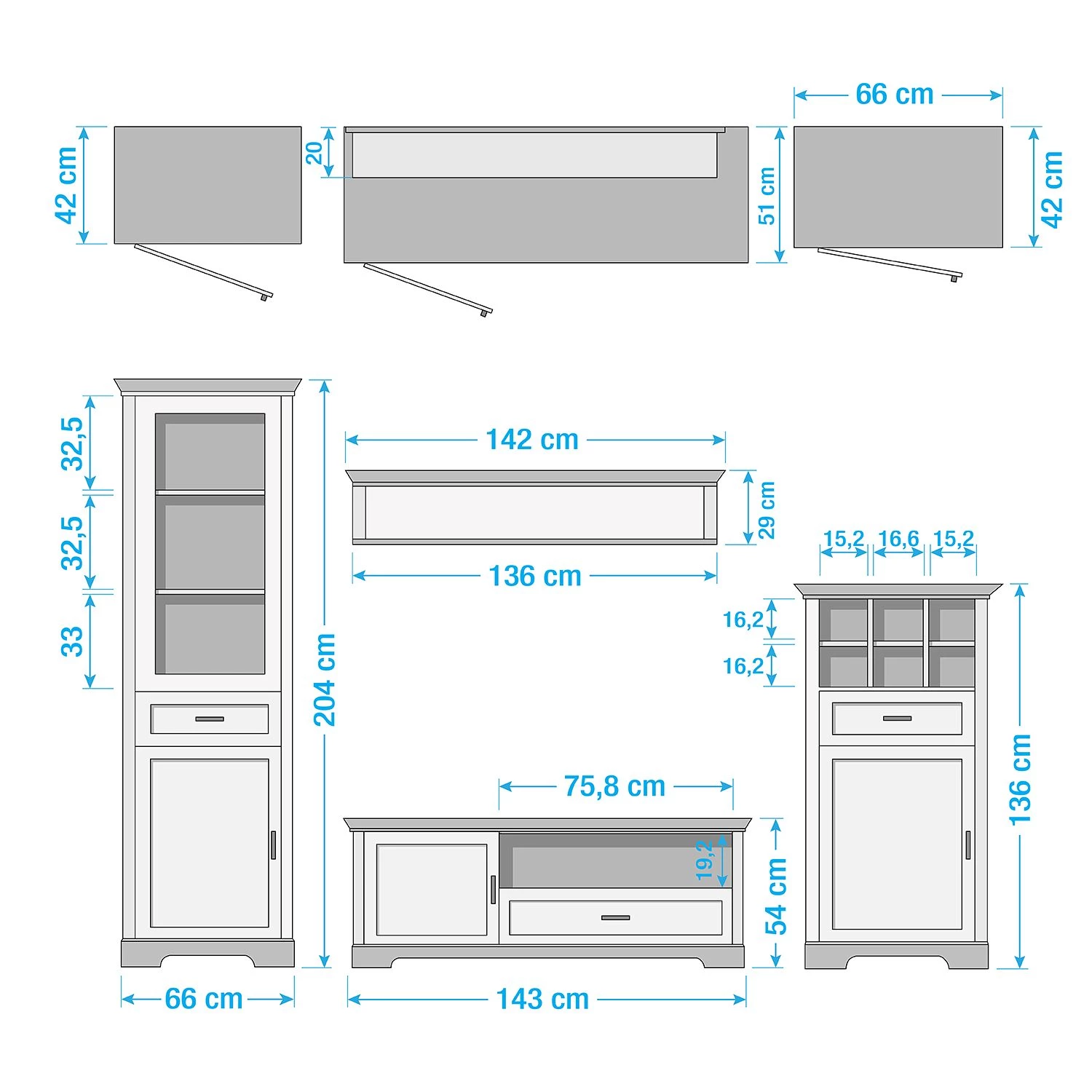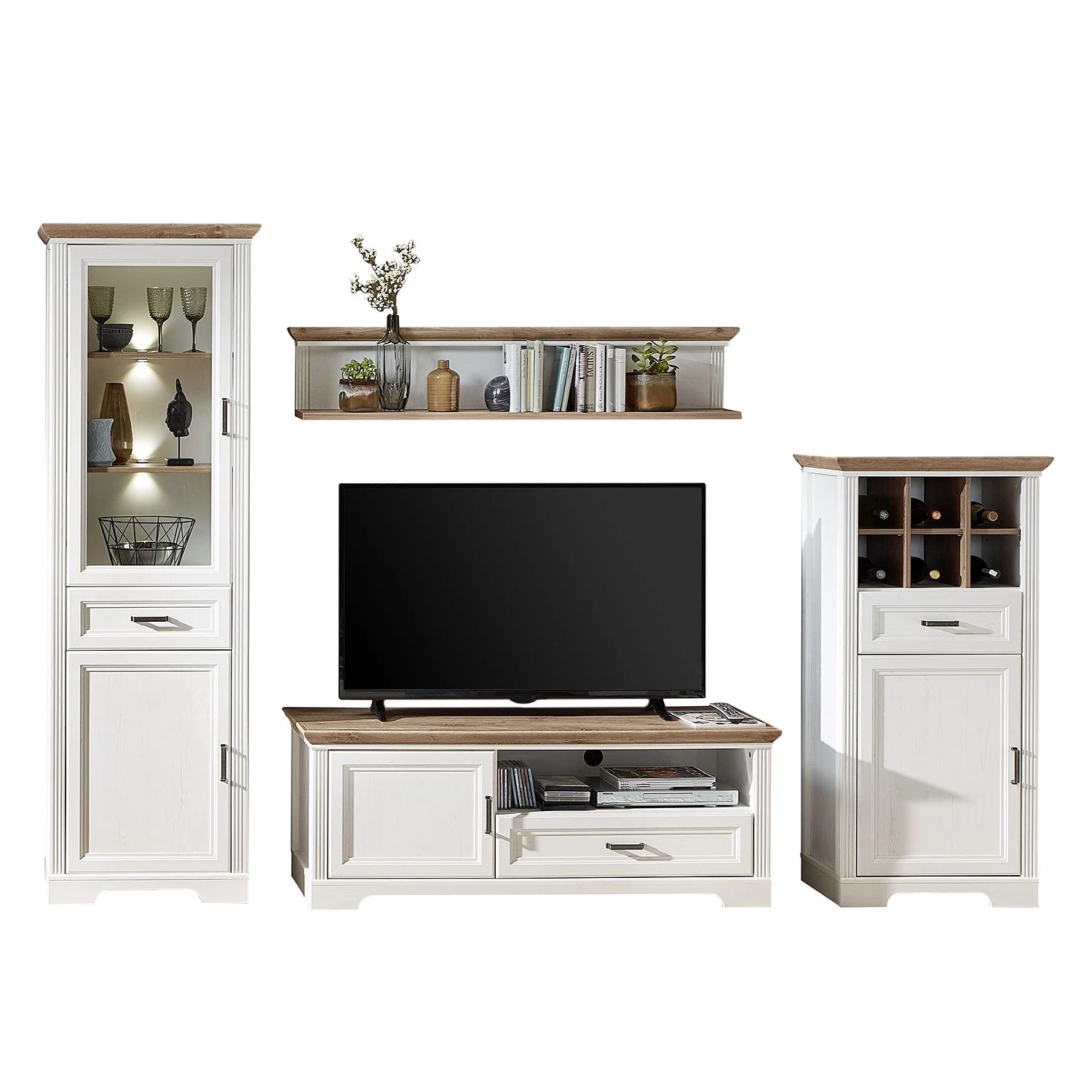 - Contenu de la livraison : Ensemble comprenant 1 vitrine, 1 buffet haut, 1 meuble TV et 1 étagère murale