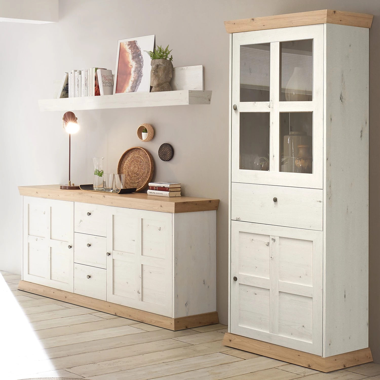 - Contenu de la livraison : Ensemble comprenant 1 enfilade, 1 tablette murale et 1 vitrine, sans éclairage ni accessoires