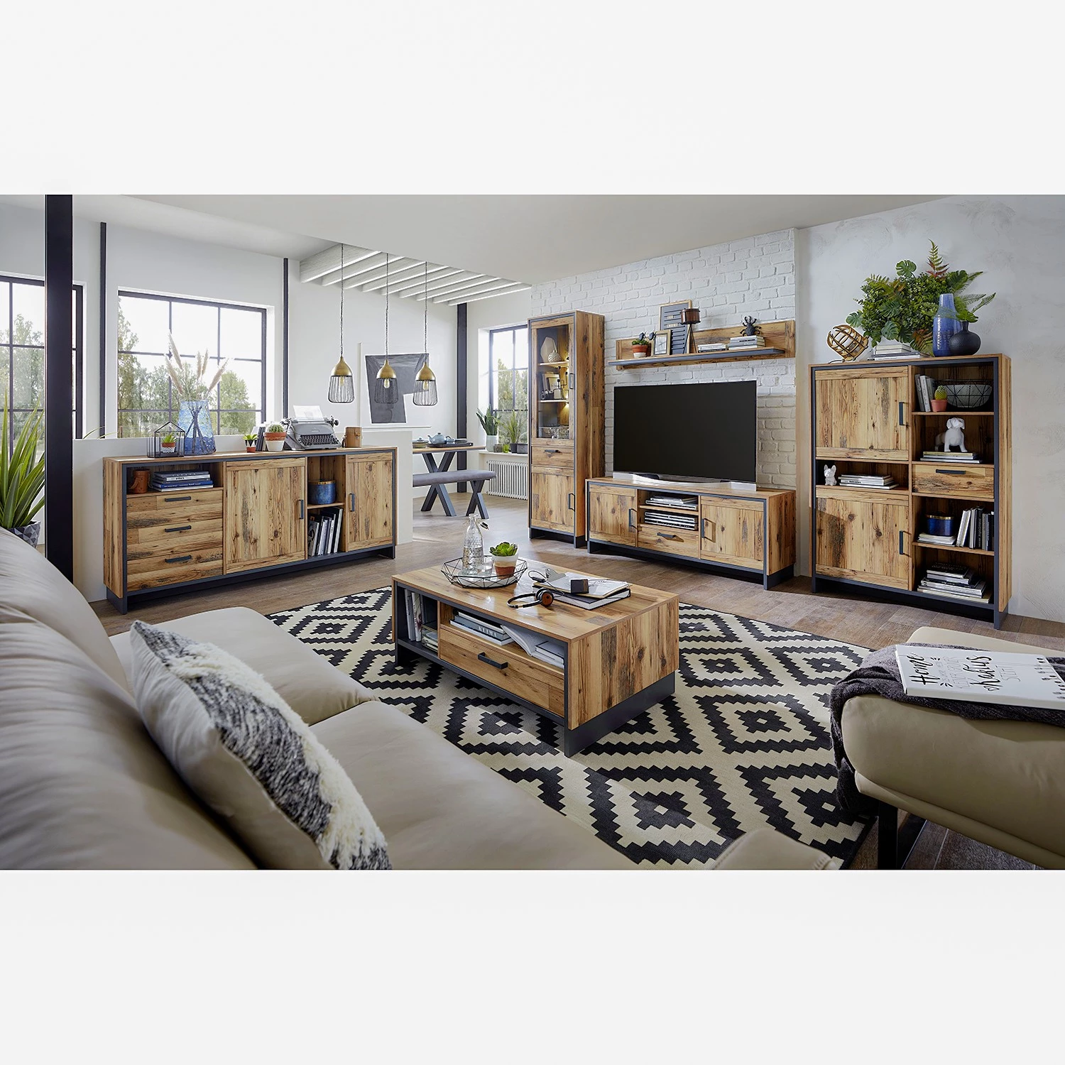 - Contenu de la livraison : Ensemble comprenant 1 vitrine, 1 tablette murale, 1 meuble TV et 1 buffet haut avec éclairage, sans accessoires