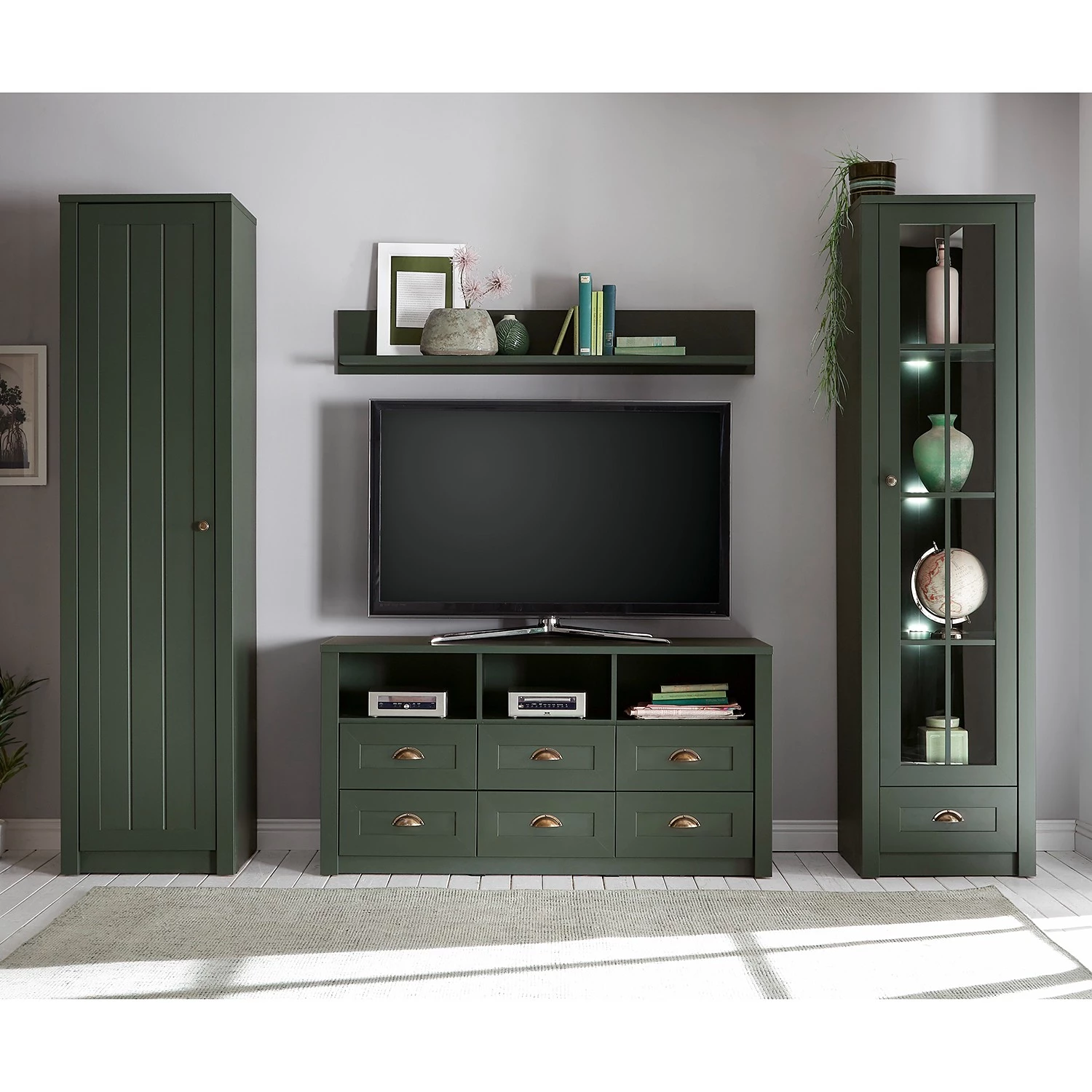 - Contenu de la livraison : 1 armoire, 1 tablette murale, 1 meuble TV et 1 vitrine, sans accessoires
