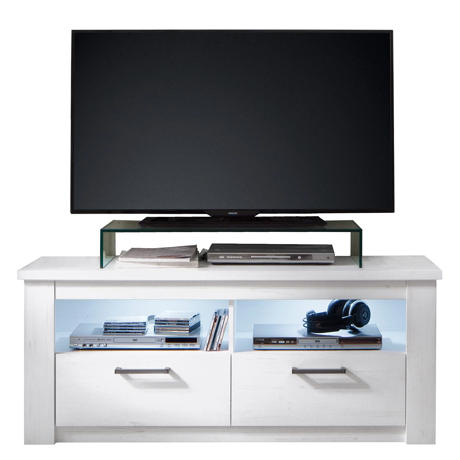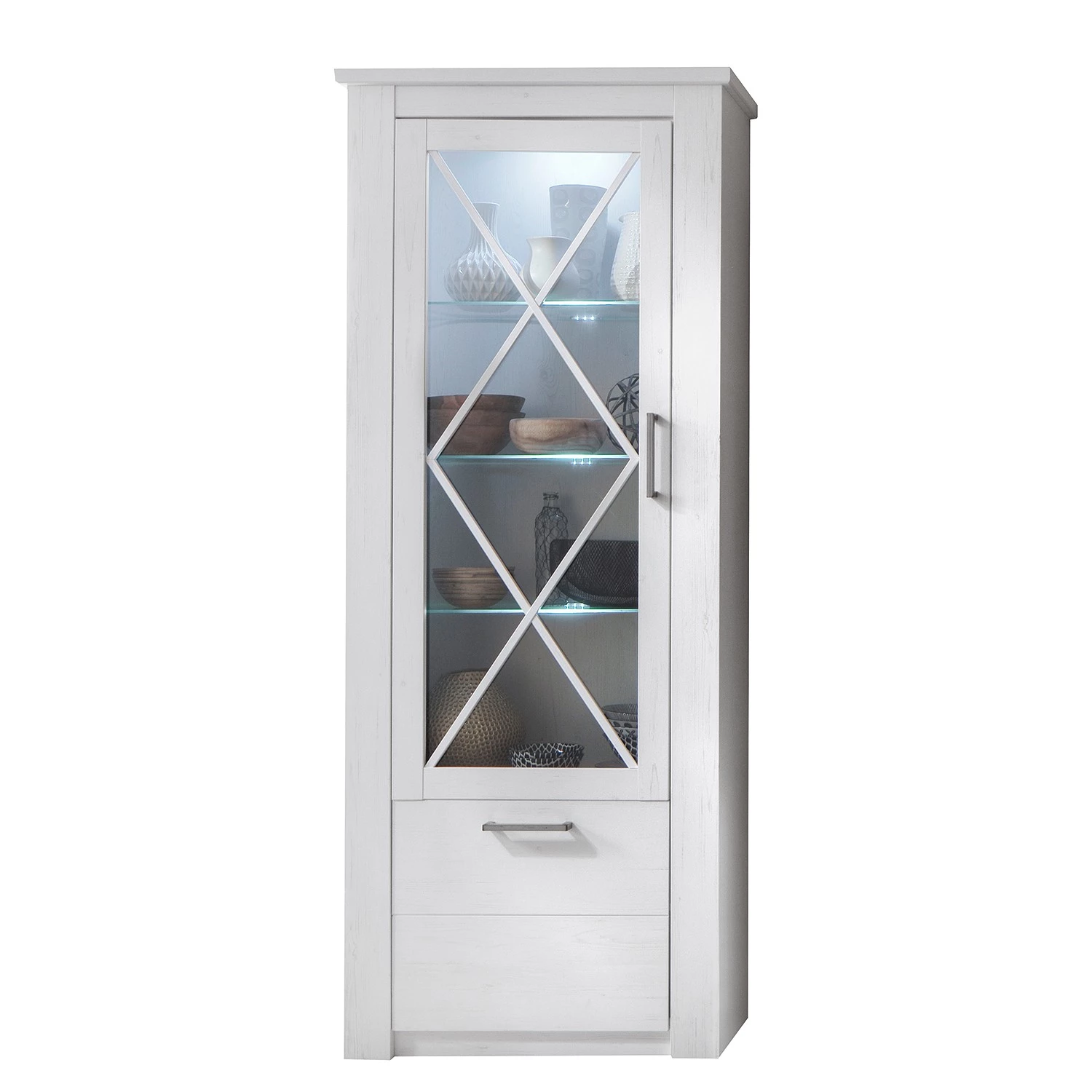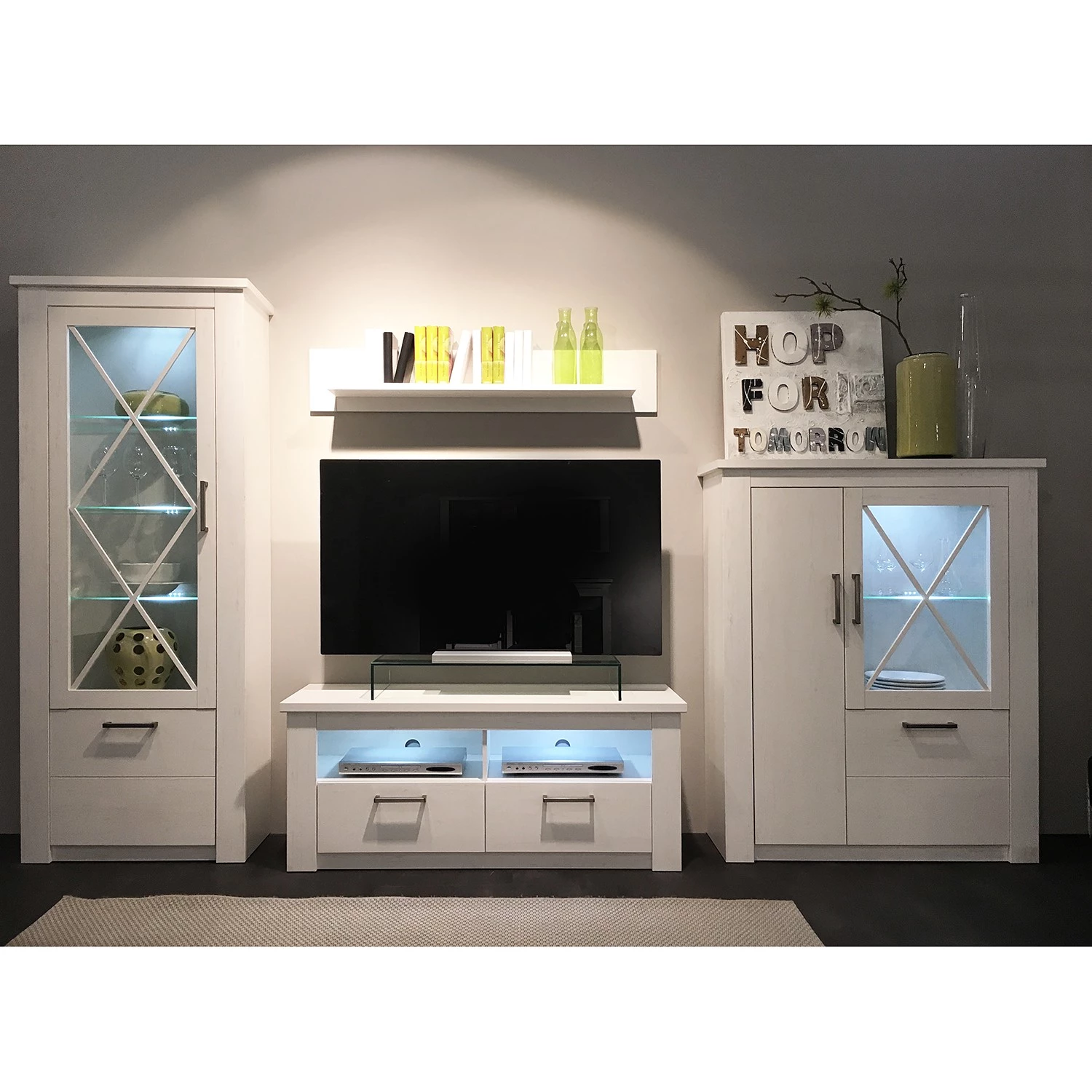 - Contenu de la livraison : Ensemble comprenant 1 vitrine, 1 tablette murale, 1 meuble TV et 1 buffet haut, sans éclairage ni accessoires